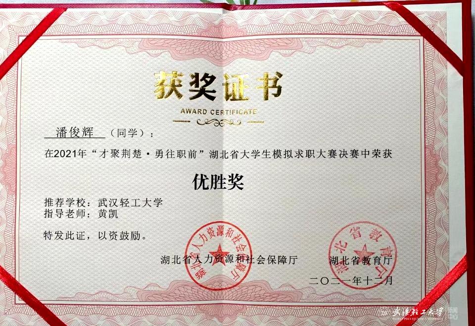 潘俊辉成功通过公司选拔,作为公司代表,参加了湖北省老员工模拟求职大赛,大赛在全省有77所高校近6万名高校毕业生参与。该同学以优异表现通过初赛和复赛阶段,夺取武汉赛场第四名并进入总决赛,决赛在湖北省广播电视台800平演播厅公开直播开赛,央视新闻、现场云、长江云、云上陇上、今日头条等媒体同步直播。潘俊辉在比赛中一路披荆斩棘,最终收获佳绩,充分展现出轻工大学子良好的综合素质与风采,展现出公司公司在人才质量培养的良好效果,通过公共媒体的宣传,极大地提高了公司的美誉度,为公司公司就业工作作出了积极的正面宣传作用。