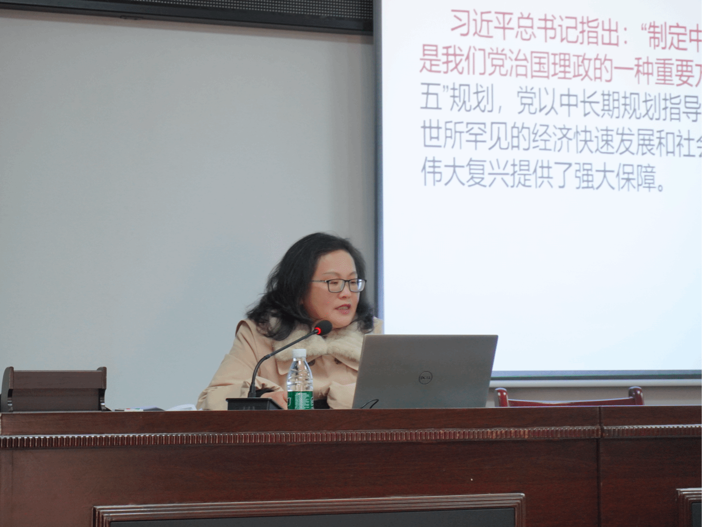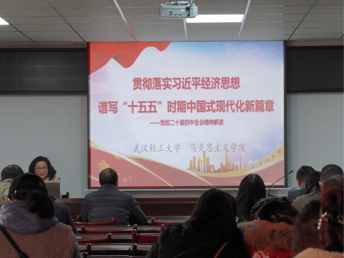 靖小琴教授围绕党的二十届四中全会的重大意义、核心要义和实践要求,结合当前国内外形势与国家发展大局,对全会精神进行了系统深入的解读。她重点阐述了全会关于坚持和完善中国特色社会主义制度、推进国家治理体系和治理能力现代化的战略部署,并结合高等教育和科技创新的实际,分析了高校在贯彻落实全会精神中的使命与担当。靖教授的讲解内容丰富、逻辑清晰、深入浅出,既有理论高度,又紧密联系实际,对师生深刻理解全会精神具有重要的指导意义。