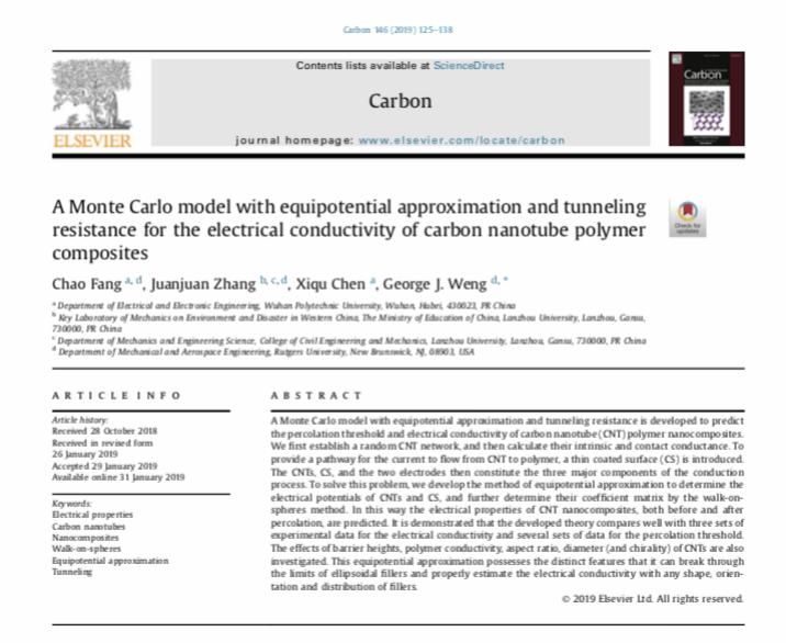 近日,beats365官方网站方焯博士、陈西曲教授与兰州大学机械工程公司张娟娟博士、美国罗格斯大学机械与航空航天工程系George J. Weng教授在碳纳米管复合材料导电特性方面取得了重要研究成果,该成果以“A Monte Carlo model with equipotential approximation and tunneling resistance for the electrical conductivity of carbon nanotube polymer composites”为题在国际著名学术期刊《Carbon》上发表。该期刊为SCI一区Top期刊,影响因子为7.082。这也是公司建立以来第一篇发表在Top期刊上的论文。