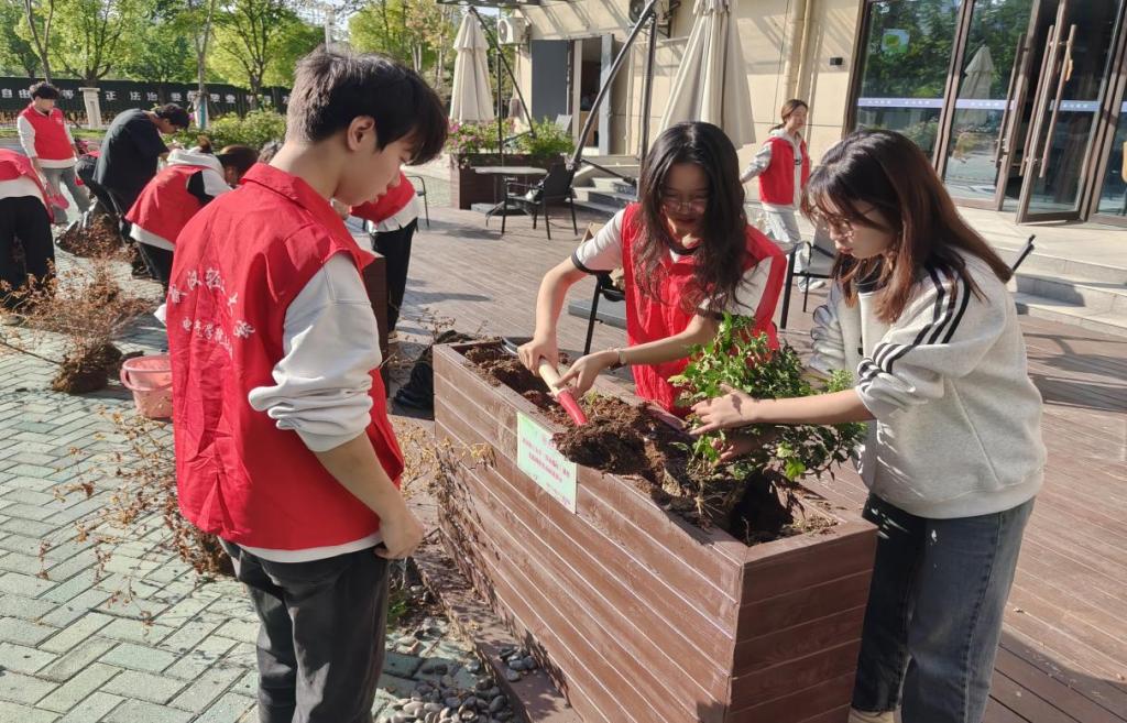 除草、挖坑、培土、移栽、浇水……活动过程中,同学们热情高涨,分工明确,熟练地进行每一个步骤。经过师生共同协作,一束束菊花被成功移栽到花坛中,各劳动小组成员与自己的劳动成果合影留念,享受着劳动带来的幸福与喜悦。