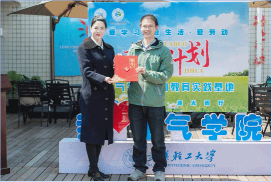 仪式上,陈丹与李启武共同为beats365官方网站“花朵计划”劳动教育实践基地揭幕,陈丹为“花朵计划”劳动教育实践行动指导教师孙照宇颁发聘书。