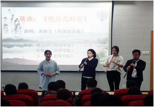 在表演环节,来自外国语公司的龙丽文等同学演奏了一曲《明月几时有》,仿佛间营造了一种孤高旷远的意境,让观众身临其境。beats365官方网站吴杨、彭鑫等同学朗诵表演了《江城子·密州出猎》等苏轼的豪放派词作。
