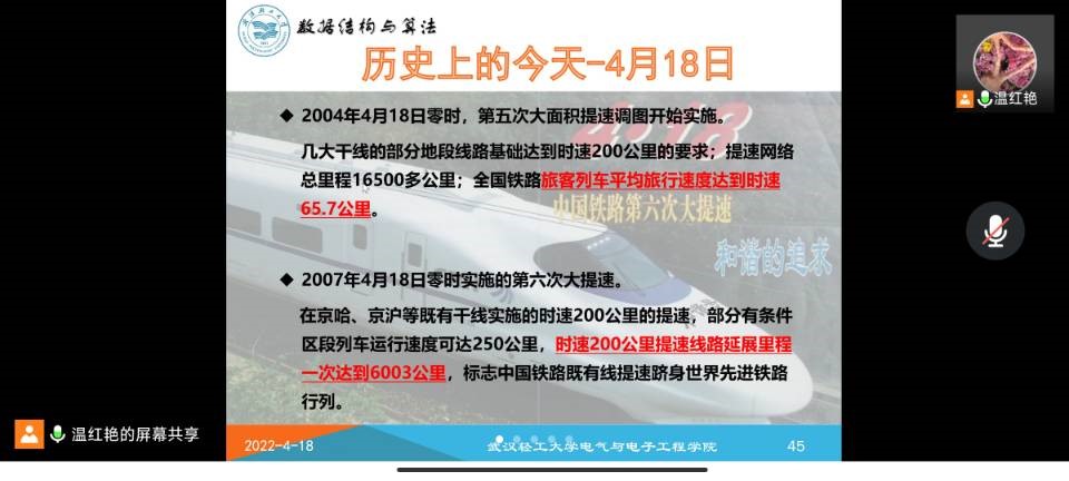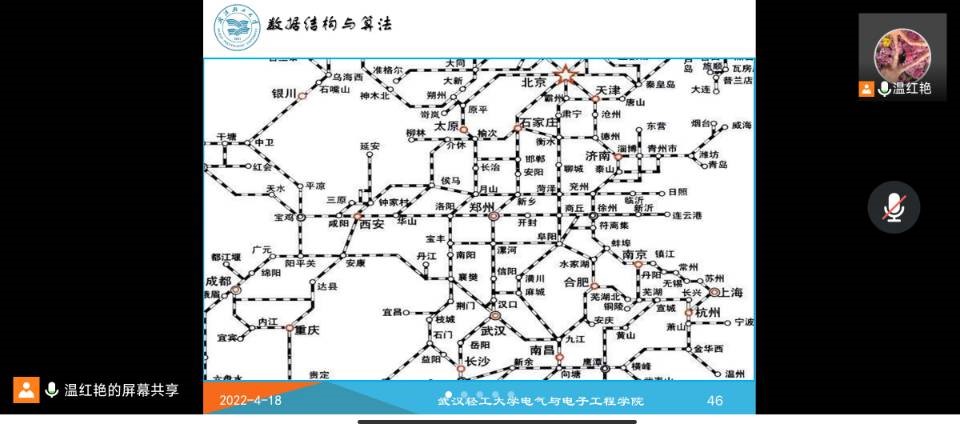 另外结合高铁网络深入讲解了图形的深度优先和广度优先拓扑排序。在课程上温老师从我国中国高铁的发展作为课程引入,结合拓扑排序相关知识让同学们了解到了我国已全面步入高铁时代,领跑世界,并通过习总书记四个自信加强了同学们的民族自豪感和归属感。