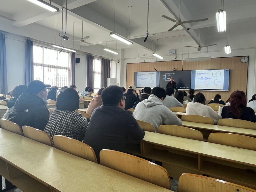 2024年3月28日上午11点05分,2023年-2024年第二学期电工电子教学示范中心教学公开课在科教311展开,授课教师为周天庆,授课课程为电工与电子技术III,授课班级为给排水2201班和2202班,应到47人,实到47人.参与的老师有夏秋华,戴哲转,胡涛,张玉姣。首先复习1.8节(叠加定理),1.9节(电源的等效变换),讲解1.10节戴维宁定理以及1.11节电路中的电位。在授课过程中,周天庆老师通过上次课电源的等效变换的课后思考题把有源二端网络等效成了一个电压源与电阻串联的模型从而引出戴维宁定理。求戴维宁等效电阻的时候,要把有源二端网络中所有电源取消,这个知识点和叠加定理中取消电源时的做法一致。马克思说事物是具有普遍联系的,且联系具有四个特点:1、客观性:联系是事物本身固有的,是不依人的意志转移的客观联系。2、普遍性:任何事物都具有内在的结构;任何事物都不能孤立存在;世界是相互联系的统一整体。3、多样性:内部联系与外部联系;主要联系与次要联系;偶然联系与必然联系;直接联系与间接联系;本质联系与非本质联系;事物内部和事物之间存在状态和发展趋势。戴维宁,是继教材中依次提到的欧姆,基尔霍夫后的第三个外国物理学家的名字,戴维宁定理就是以这个物理学家的名字命名的定理,戴维宁因这个定理流芳百世。周老师由此鼓励员工努力学习,勤于钻研,没准不久的将来就能诞生出以我们员工名字命名的定理定律,为祖国的富强尽可能地奉献我们理工人的智慧,激发员工源源不断的内生动力。