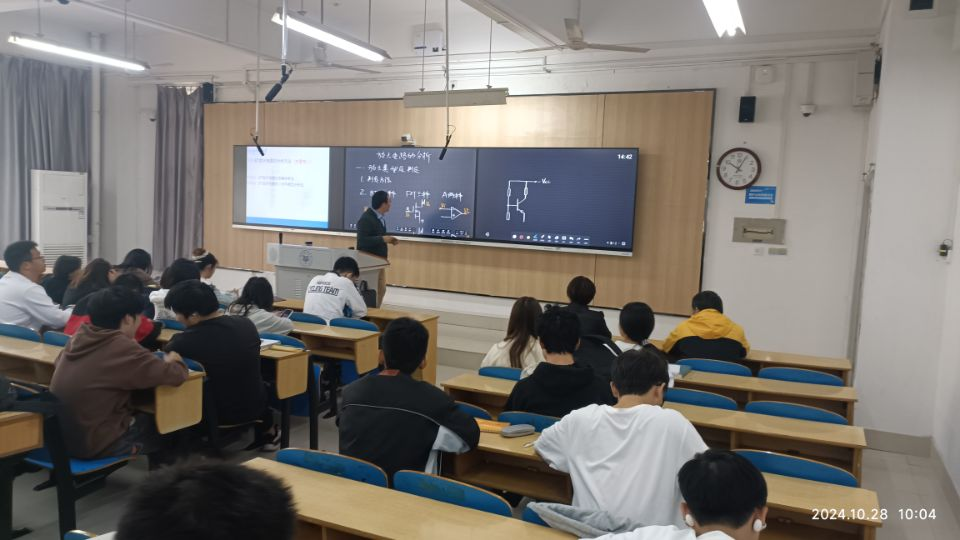 2024年10月28日上午,2024年-2025年第一学期电工电子教学示范中心教学公开课在基础楼104展开,授课教师为李战胜,授课课程为模拟电子技术Ⅱ,授课班级为自动化2301-2班,应到59人,实到59人,授课内容BJT即双极结型晶体管构成的放大电路及其分析,参与老师有电工电子教学示范中心相关老师。在授课过程中,李战胜老师通过介绍BJT以及其构成的三种放大电路,并提出了“直流、交流”的分析思路:通过绘制放大电路对应的直流通路,再通过欧姆定律和基尔霍夫定律计算相应的Q点参数,这个体现了“直流”分析的特征,而又通过绘制微变等效电路,其中的关键是绘制交流通路,最后计算交流动态参数,掌握住相应的分析思路后对三种放大电路进行总结。放大电路的分析方法有多种,通过这个学习,告诉员工遇事不要慌,不要钻牛角尖,多思考,办法总比问题多。并且从不同类型的基本放大电路具有不同的特性角度出发,共发射极基本放大电路,放大倍数的绝对值比较大,但是输入电阻比较小,共集电极基本放大电路(射极输出器),放大倍数小于等于1,但是其输入电阻比较大,输出电阻比较小。从这里可以看到,专业知识里面也蕴藏着一些做人的道理。俗话说:上帝是公平的,它给了你美貌,可能没有给你智慧;给了你智慧,可能没有给你健全的体魄;给了你健康的身体,可能没有给你美貌。一个人总会有一些优点,也存在一些不足,在生活中要注意善于扬长避短,发挥自己应有的作用。