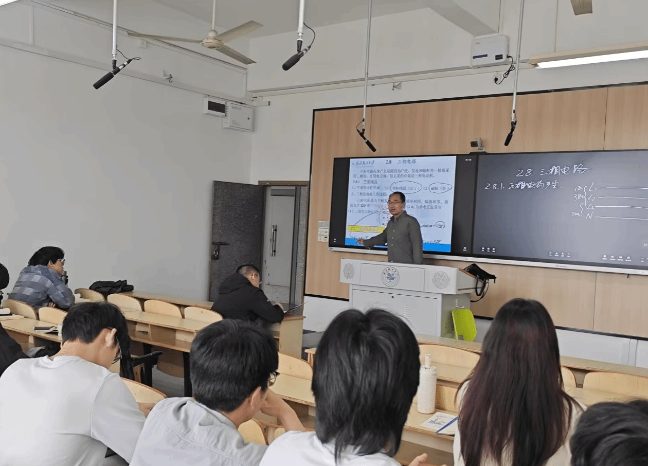 2025年4月22日上午10点10分,2024年-2025年第二学期电工电子教学示范中心教学公开课在科教309展开,授课教师为周天庆,授课课程为电工与电子技术III,授课班级为给排水2301班,应到22人,实到22人.参与的老师有胡涛,张玉姣。首先复习2.5节(阻抗串并联),2.7节(功率因素的提高),然后讲解2.8节三相电路。